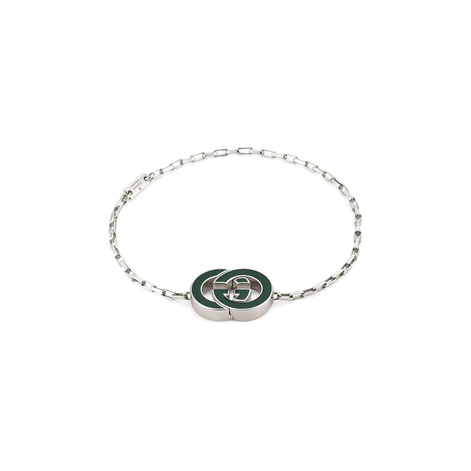 Η συλλογή ασημένιων κοσμημάτων του οίκου συνεχίζει να επανερμηνεύει εμβληματικά μοτίβα, συνδυασμένα με πολυτελή υλικά και περίπλοκη κατασκευή. Χαρακτηριστικό είναι αυτό το βραχιόλι με το σύμβολο Interlocking G και το σμάλτο σε πράσινο χρώμα, το οποίο λειτουργεί τόσο σχεδιαστικά, όσο και πρακτικά ως μαγνητικό κούμπωμα.