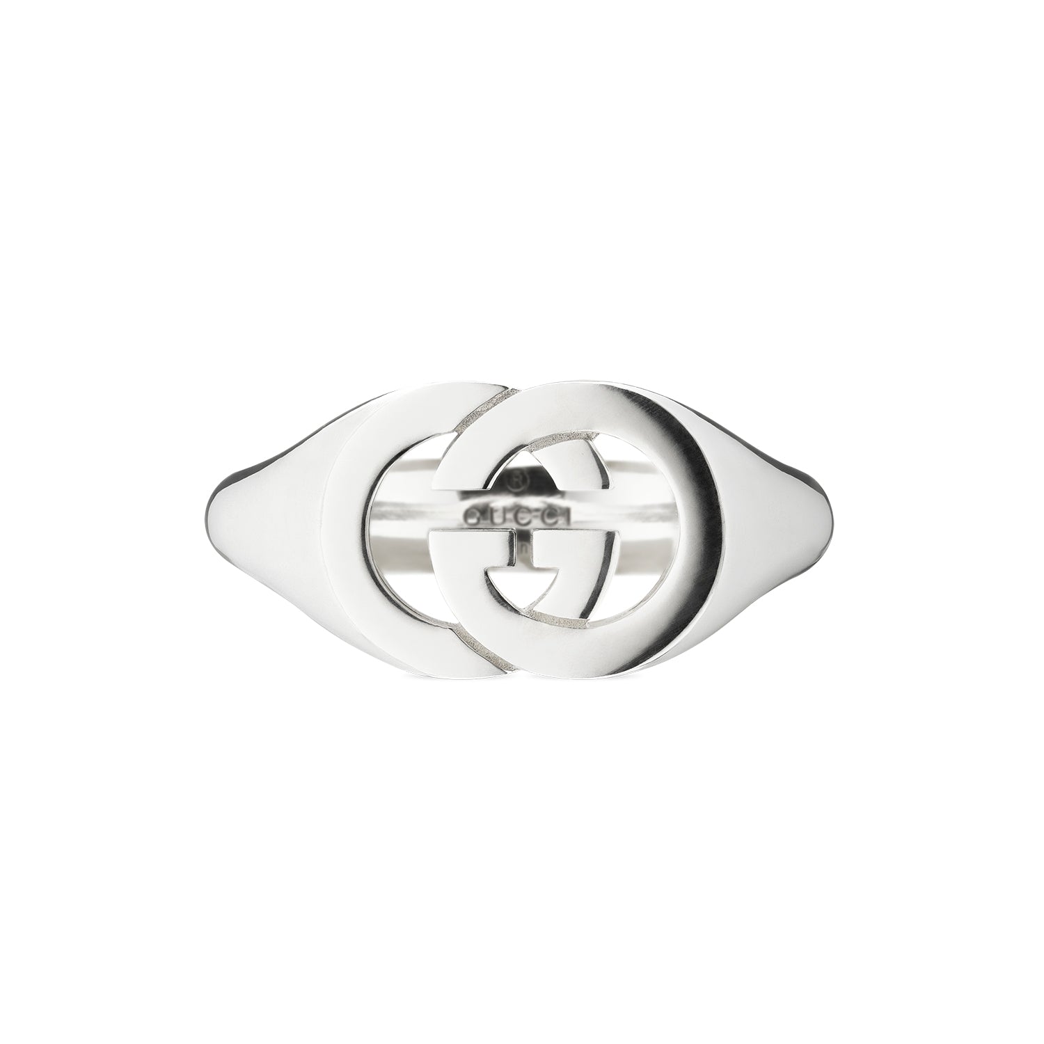 Η συλλογή ασημένιων κοσμημάτων του οίκου συνεχίζει να επανερμηνεύει εμβληματικά μοτίβα, συνδυασμένα με πολυτελή υλικά και περίπλοκη κατασκευή. Χαρακτηριστικό είναι αυτό το δαχτυλίδι το οποίο είναι διακοσμημένο με το σύμβολο Interlocking G.