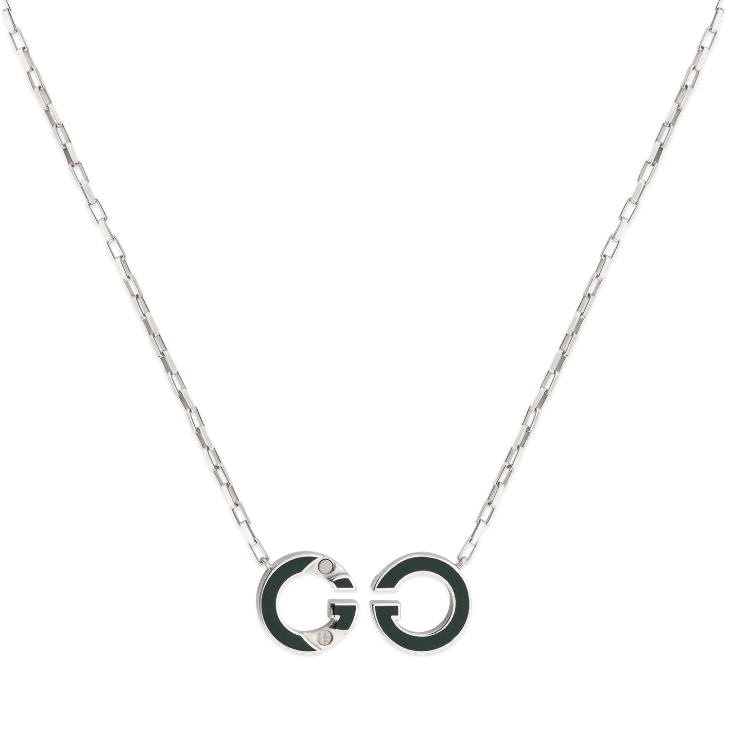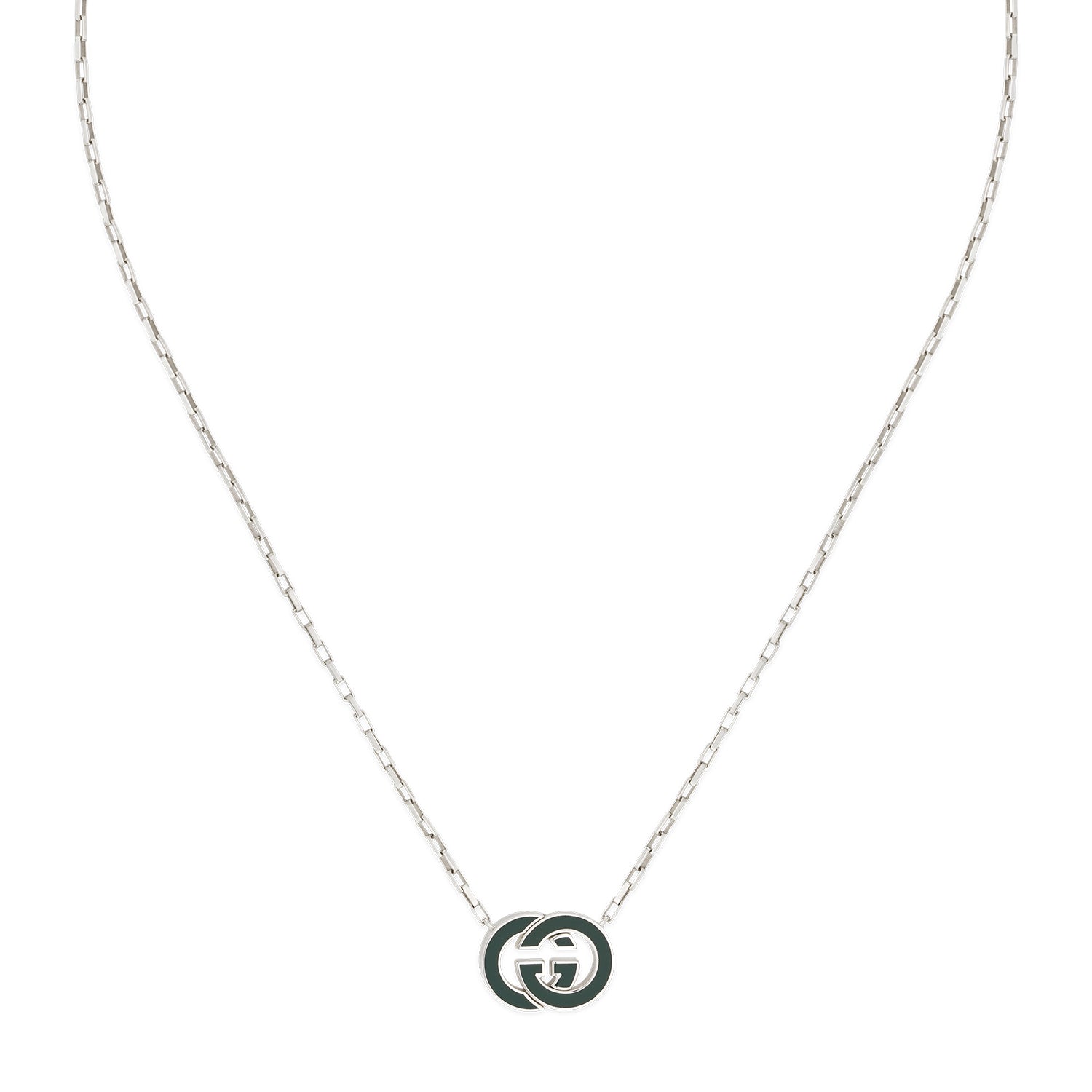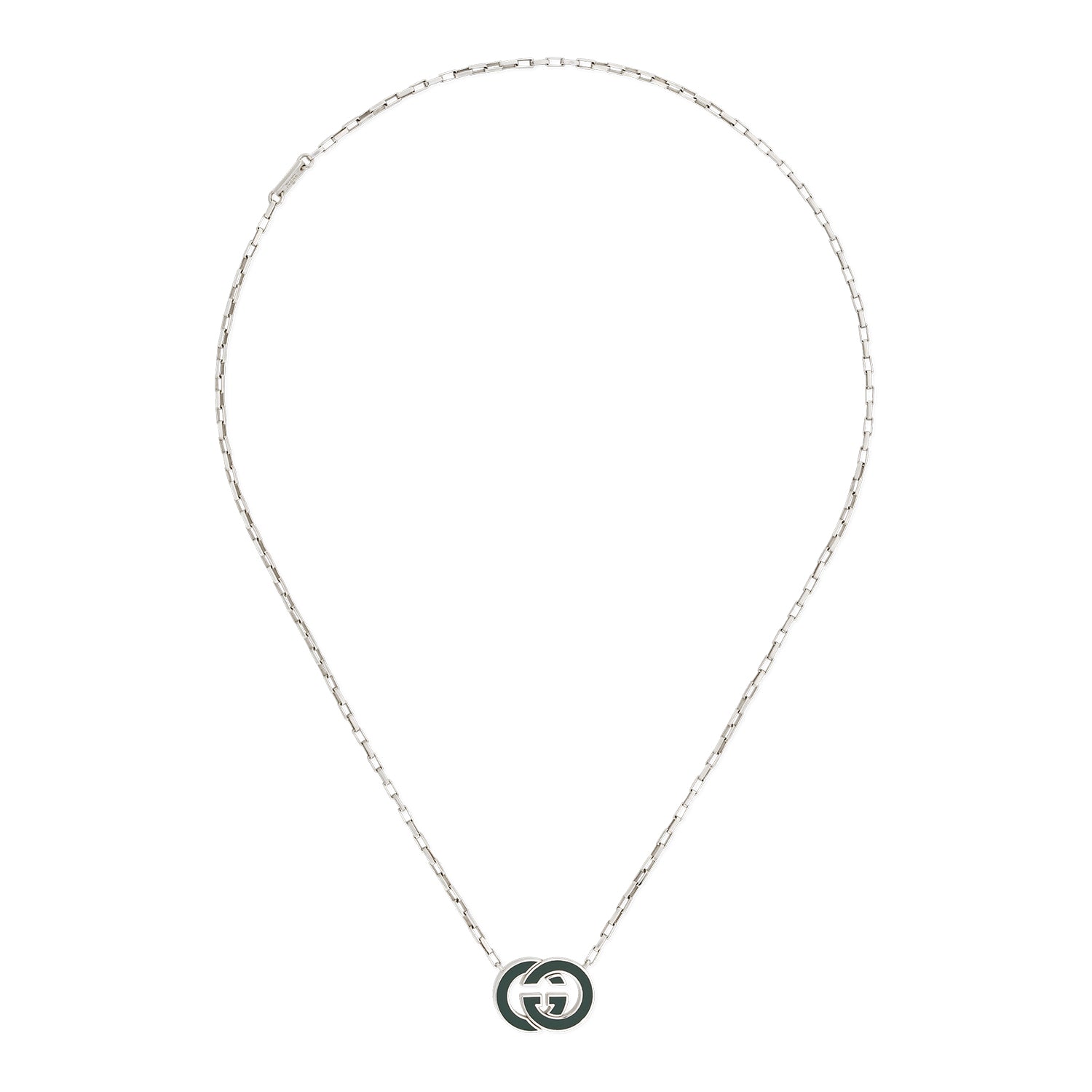 Η συλλογή ασημένιων κοσμημάτων του οίκου συνεχίζει να επανερμηνεύει εμβληματικά μοτίβα, συνδυασμένα με πολυτελή υλικά και φρέσκες αποχρώσεις. Χαρακτηριστικό είναι αυτό το κολιέ με το σμάλτο πάνω στο σύμβολο Interlocking G, το οποίο λειτουργεί τόσο σχεδιαστικά, όσο και πρακτικά ως μαγνητικό κούμπωμα.